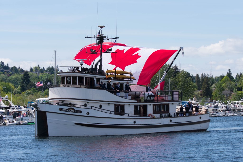 Last Wednesday morning we were very excited to head to Philbrooks in Sidney, BC to pick up Miss Miranda after a month of maintenance work and a few upgrades. We boarded the Washington State ferry that goes from Anacortes to Sidney once a day and settled in for a pleasant 3 hour cruise. About 1 mile away from the dock, the boat came to a stop. After a while , it turned around and headed back to the dock, where we sat for 90 minutes while they tried to fix “mechanical difficulties” and warned us not to use the toilets. But after all that, the sailing was cancelled for the day and we disembarked, wondering how the heck we were going to get to Sidney that day. We had a tight schedule because we were committed to taking the boat down to Seattle for Opening Day of boating season weekend. We had promised Miranda that she could host a bunch of her college pals for the big event on Saturday. And, this was likely our last Opening Day for a long time and we wanted to catch up with our friends before we depart.