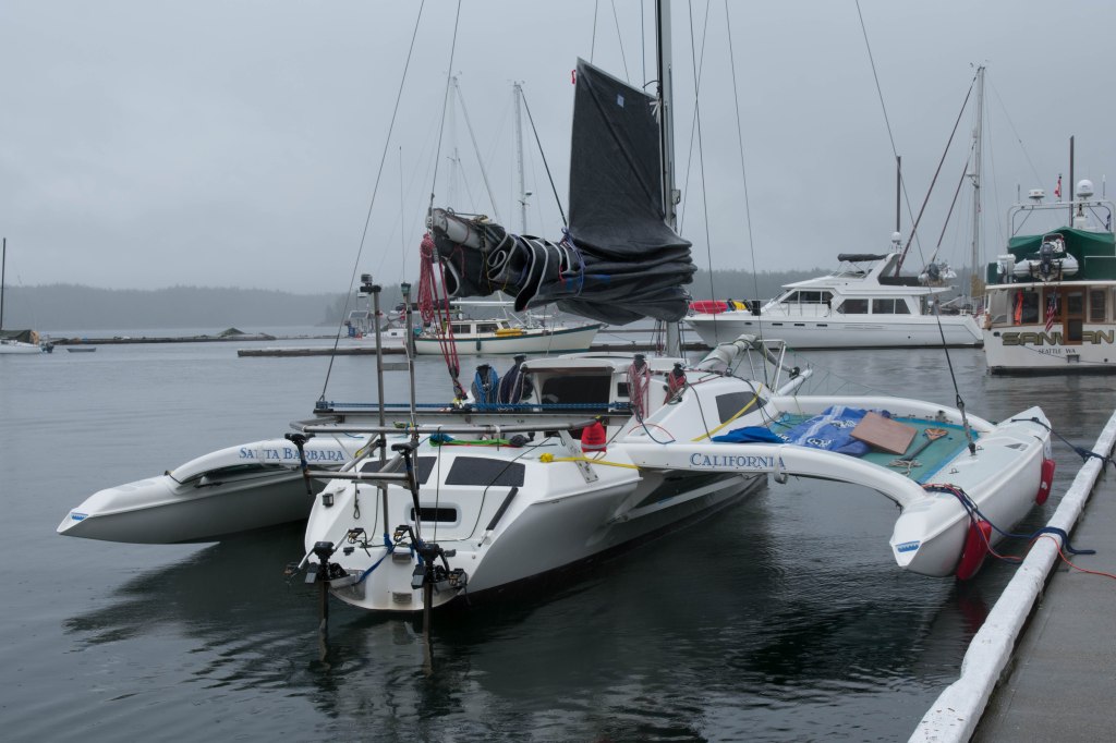 Walking on the dock back at Shearwater, we also saw the trimaran Triceratops that we had heard in distress on the radio yesterday – their rudder had broken and they needed assistance out in Queen Charlotte Strait. Turns out they are one of the Race to Alaska boats, all no-engine boats racing 750 miles from Port Townsend Washington to Ketchikan as fast as they can. He was fast at work crafting a new rudder and intends to continue on to complete the race – so we didn’t keep him too long talking!