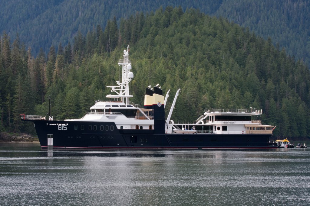 We dingy explored up the Khutze river which empties into the Inlet looking for bears. We were finally rewarded with a brown bear on shore eating grass right before bedtime. We had already put the dingy up so couldn’t rush to get a closer picture.