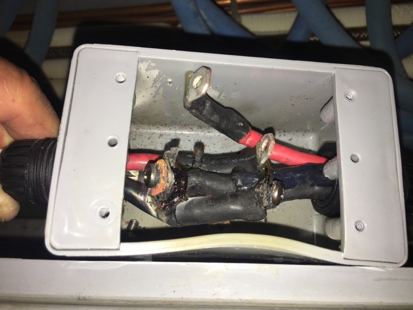 When we got to Cannery Cove, I opened up the breaker box and found that one of the connectors to the breaker had burned right off – see the photo below. The breaker showed clear signs of overheating and the box had indeed melted on that side. Furthermore, the wire insulation (at least) had melted and essentially fused all of the wires together. We are DAMN lucky that we didn’t have an engine room fire.