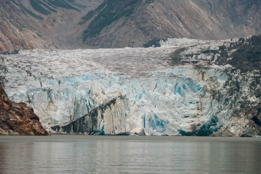 We left “No Name” cove in the morning to travel up Tracey Arm to see the Sawyer Glacier, a tidewater glacier with two arms that can be reached by boat. The challenge in visiting these glaciers are the icebergs and “bergy bits” that come from calving of the glaciers. Of these, the bergy bits are actually the bigger challenge, as some of them are clear and very difficult to spot in the water.