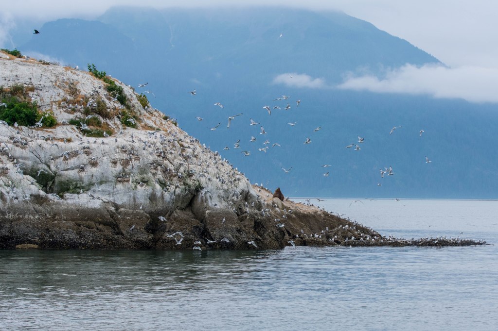 On our last full day we headed back to Bartlett Cove.  On the way we stopped alongside Marble Island  – a sea lion and sea bird refuge.  Boats are allowed within 50 yards so it was easier to get some good photos.  The one thing the photos can’t capture is the noise of the lions barking and grunting and groaning and the birds all calling – it was intense!