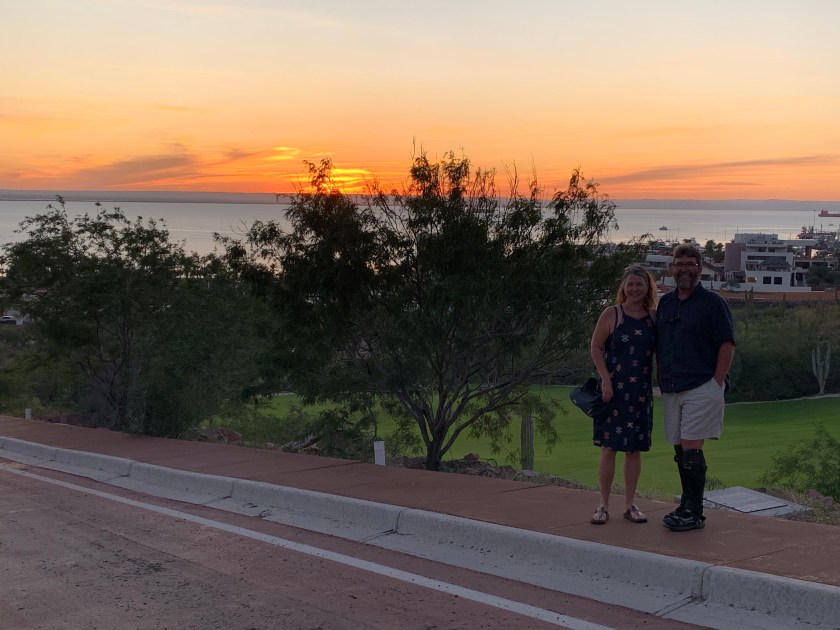 Our first night there we wanted to celebrate reaching the La Paz milestone, so we splurged and headed to the Sunset Bar up on the hill at the resort. We got a ride in a golf cart, but soon found ourselves on the side of the road because the golf cart battery was a bit low, and it couldn’t make it up the hill. Our scooter escort tried to help us, but no bueno. It was quite humorous all the way around, and we eventually hitched a ride up in the golf course van.
