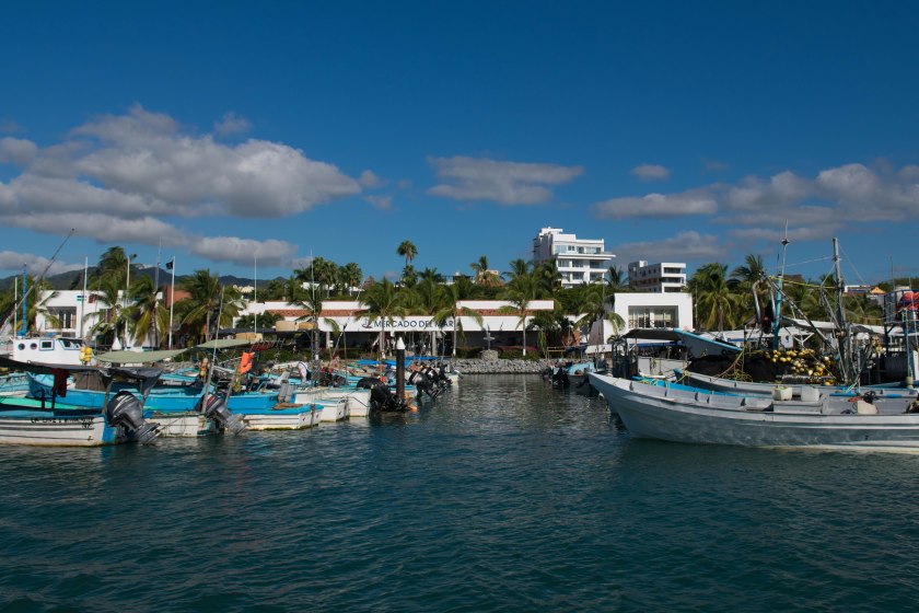One of our favorite areas is the fish market right at the marina featuring the local catch, and shrimp brought in from Mazatlan.  It was impressive to see the large Tuna, Dorado, Snapper and other fish being brought up from the fishing fleet moored right in front of the market.  The market itself seems more frequented by Mexicans than gringos when we’ve shopped there. I learned from watching and asking what some of the more interesting appearing items were. Some very large egg sacs, and various fish parts. Didn’t want to buy them, but interesting.