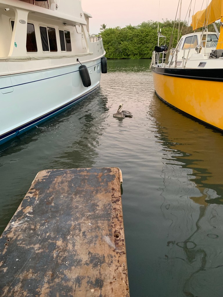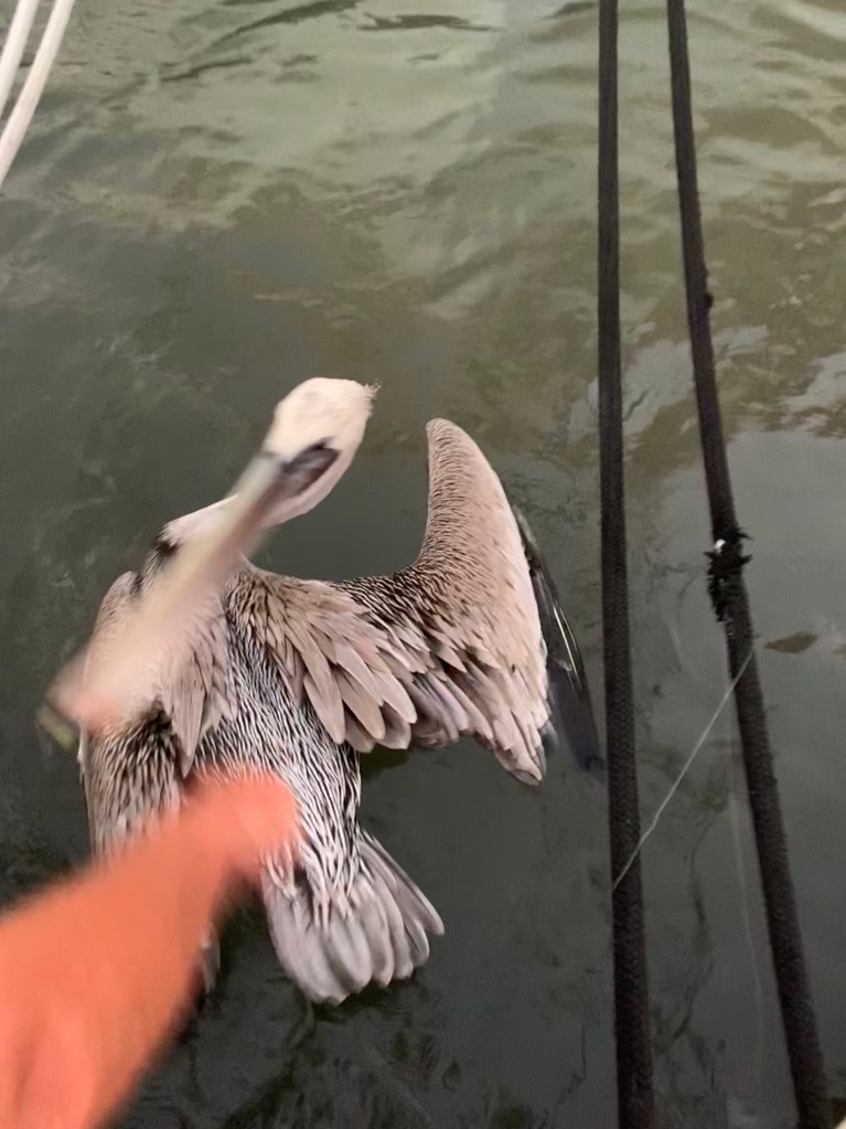 There were an enormous number of pelicans who roosted in the trees of the estuary across from us. We had a sad experience our first night with Miranda – as we were heading down the dock to dinner in the setting sun we came upon a pelican acting strangely, not flying away and flapping awkwardly right next to the dock. We soon realized he was entrapped in fishing line that someone had left actually attached to the dock.