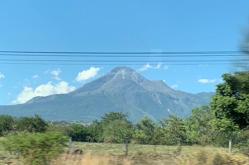 The morning after our spur of the moment decision to book a trip to Guadalajara we loaded a duffle bag and our backpacks and trudged through town to the bus station by the big marlin.  By the time we got there we were sweat soaked, so it was a wonderful surprise to discover the luxury of the ETN bus!  It was a double decker with very comfortable reclining seats, foot rests and personal video screens in case you wanted to watch movies in Spanish.  And it was air conditioned… almost too much.  We were dressed for the hot Barra weather in lightweight shorts and short sleeved shirt, ready for 85 plus degrees… not 68.  I got my hoody sweatshirt out of my duffel at a stop where I tipped the porter to dig it out for me.  Larry didn’t think to prepare for cooler weather, so spent some time actually feeling chilly.  The ride was about six hours over mostly toll roads, with stops in Manzanillo, Colima, and the airport before ending at the Guadalajara bus terminal.  The roads were initially lined with short banana trees with bunches of bananas waiting to ripen and tall palm trees interspersed.   As we continued we had some spectacular views of the 12,000+ foot Colima Volcano and went through an area of deep gorges where the road went across viaducts over the canyons below.