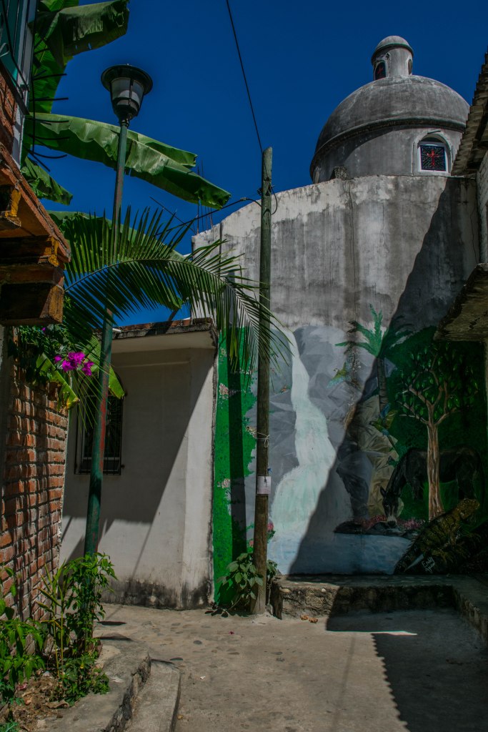 After tying up, Philipe took us over to the village dock, where we walked through the hillside town up a paved path to the waterfall. Along the way, we met Charlie the burrow and his owner, Manuel, a lifetime Yelapa resident. Here along the path, families set up open air shops featuring their handmade wares. We wound up buying two light blankets made by a son and daughter of Manuel.