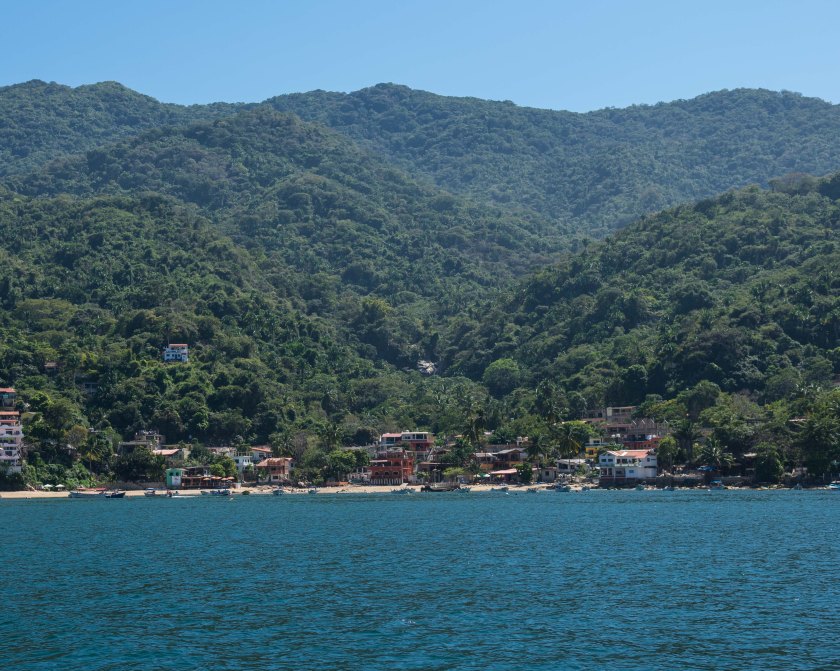 We headed off around 9 AM and saw several different groups of whales along the way. We slowed and watched a couple, but after a while, we decided to keep going, wanting to get over to Yelapa before lunch. Approaching the entrance to the bay, we were greeted by Philipe in a panga from Fanny’s restaurant, a beachside palapa. He offered to guide us in to a mooring buoy, necessary here because the bay is very deep with only a small shelf suitable for anchoring. Yelapa is absolutely gorgeous, with steep cliffs covered in vegetation rising from the bay and sandy beach. It is, however, very rolly… open to the NW Pacific swell. Friends reported spending the night moored between two buoys, but also reported that their guests got seasick. If we stayed, we certainly would have had to deploy both flopper stoppers.