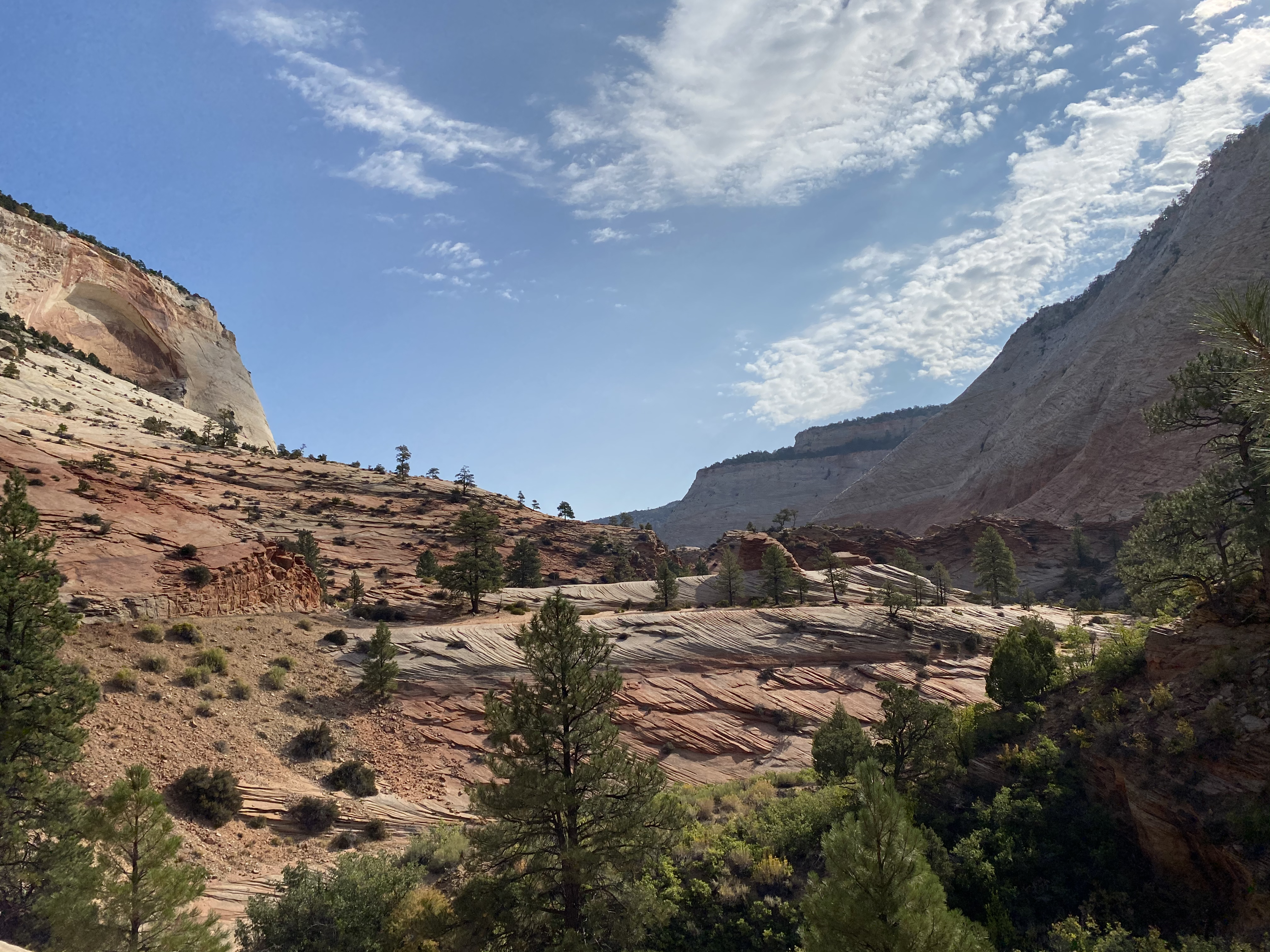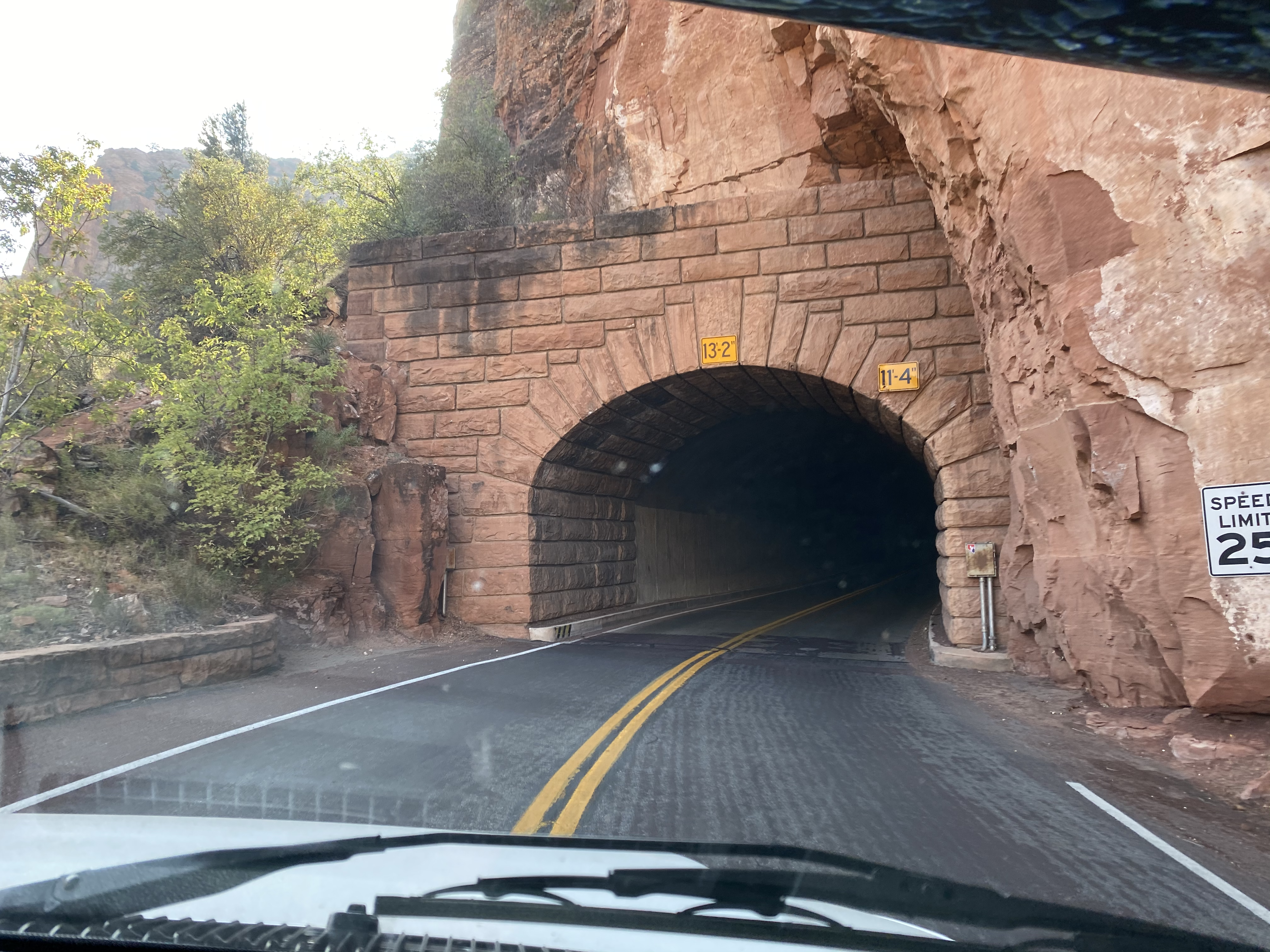 We left Zion this morning and took the Zion – Mt Carmel highway, entering the park and buying a permit to pass through the tunnel. The ride up to the tunnel was spectacular, climbing along the canyon walls. We were fortunate to get there as a one way stream of traffic was heading our way through the tunnel, so I drove right down the center lane for the 1.1 miles. There were “windows” carved out of the side of the tunnel, but I didn’t take in the view for fear of careening into the roof of the tunnel. Coming out of the tunnel, the landscape was even more spectacular as the road wound through the sandstone formations. We loved Zion.