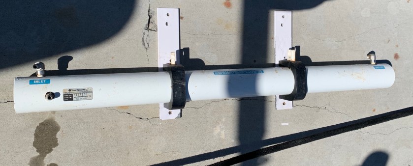 It was now time for some professional help, so we called Hector Marine, who is the local watermaker dealer. He had two techs over on the boat within an hour, and they found the same thing – the watermaker was working properly (meaning it was producing fresh water from salt water) but the quality was poor. They saw PPM readings as high as 4000, and not lower than 1500. From this they concluded that the membrane needed to be replaced. This was not terribly surprising, since it was last replaced by the previous owner in early 2015, and the average lifespan is about 5 years.