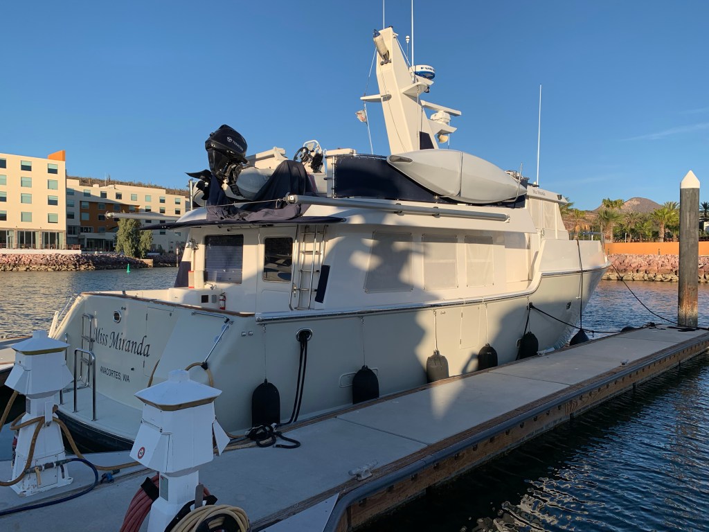 Two and half hours later after an easy drive up the toll road, passing Todos Santos, many cacti and numerous police cars, we arrived at Marina CostaBaja and Miss Miranda!