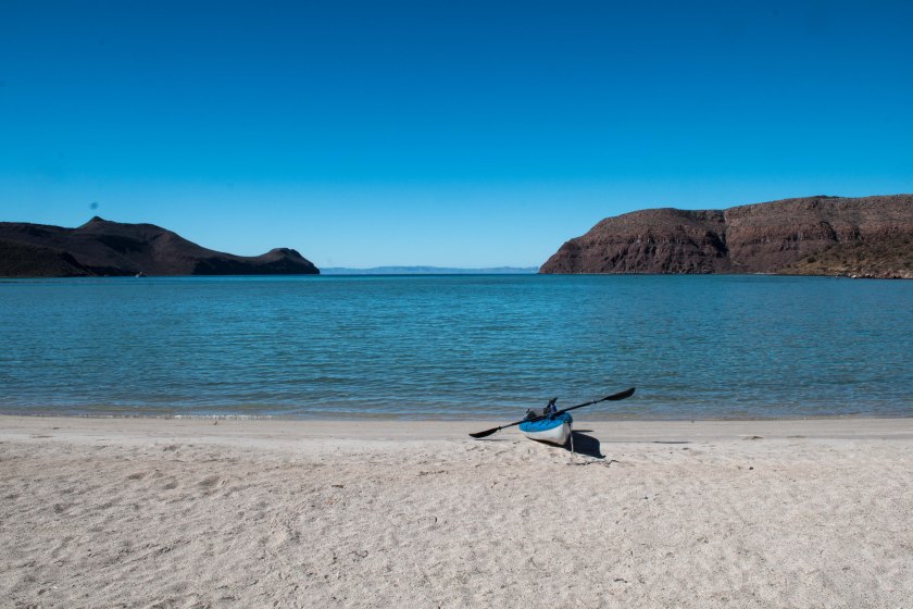 We kayaked around much of the bay, explored the beach and the unoccupied fish camp. I loved the dramatic rocky landscape, and how I could watch through the clear water to see fish going about their business. It felt great to get my kayaking muscles working again after so long away. At times we were the only boat in the bay. Occasional panga tour boats flew through the channel between the islands, and each night there were one or two catamarans anchored across the bay from us, but no one ever joined us on the beach or out kayaking.