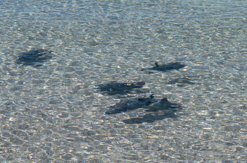 I hear the laughing of gulls, and the splashes in the northern part of the bay from pelicans dive bombing into the water. Jumping fish splash, and a turtle pops its head up from time to time, and I swear I can hear him take a breath before submerging again. Tens of small black and white diving birds repeatedly dive in unison, sometimes making it appear that a school of rays or jumping fish are coming at us. Black vultures with small red heads circle high up near the glowing cliffs and also scavenge on the beach.