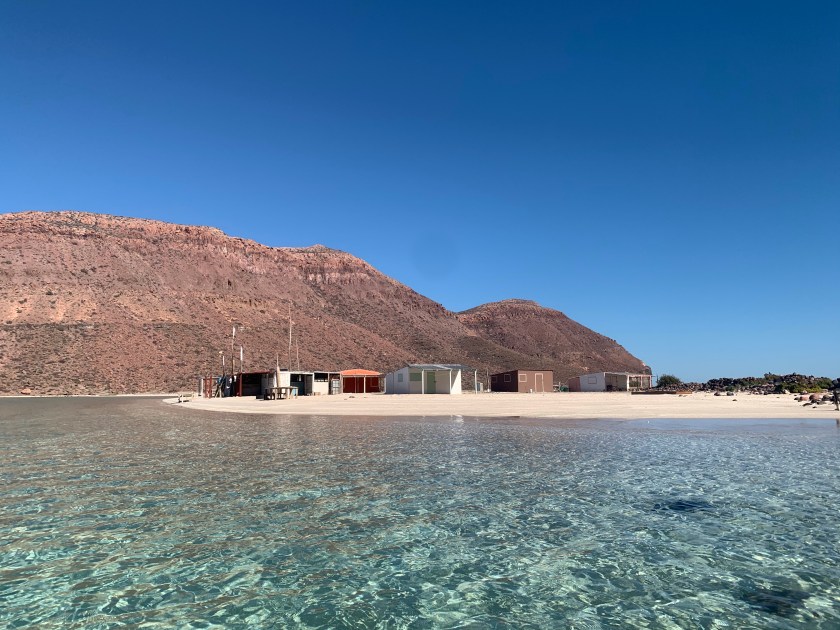 Striking rust brown sandstone hills rise steeply around the north and south sides of this ancient caldera which has subsided back into the sea. A white sand beach protrudes from Isla Partida to form the eastern part of the circle. A complementary rocky protrusion from Isla Espiritu Santo housing the park ranger’s cabin pairs with the slip of land from Partida to form a channel between the two islands. To the west, the bay opens to the Sea of Cortez with a view of the mainland Baha ridges in the distance.