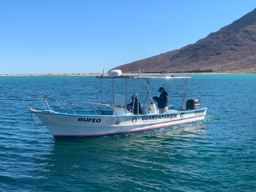 As we were finishing our morning routine, the marine park ranger pulled up in his panga to check whether we had renewed our annual park pass – Pasaporte de La Conservacion – which helps funds protection of these islands and is required to anchor and go ashore. It sounded to me like they had a registry of boats that previously had passes and they had a record of us from last year, but they didn’t have a record that we had just renewed. Espiritu Santo and Partida are within the Golfo de California Biosphere Reserve. The Sea of Cortez holds a number of marine parks.