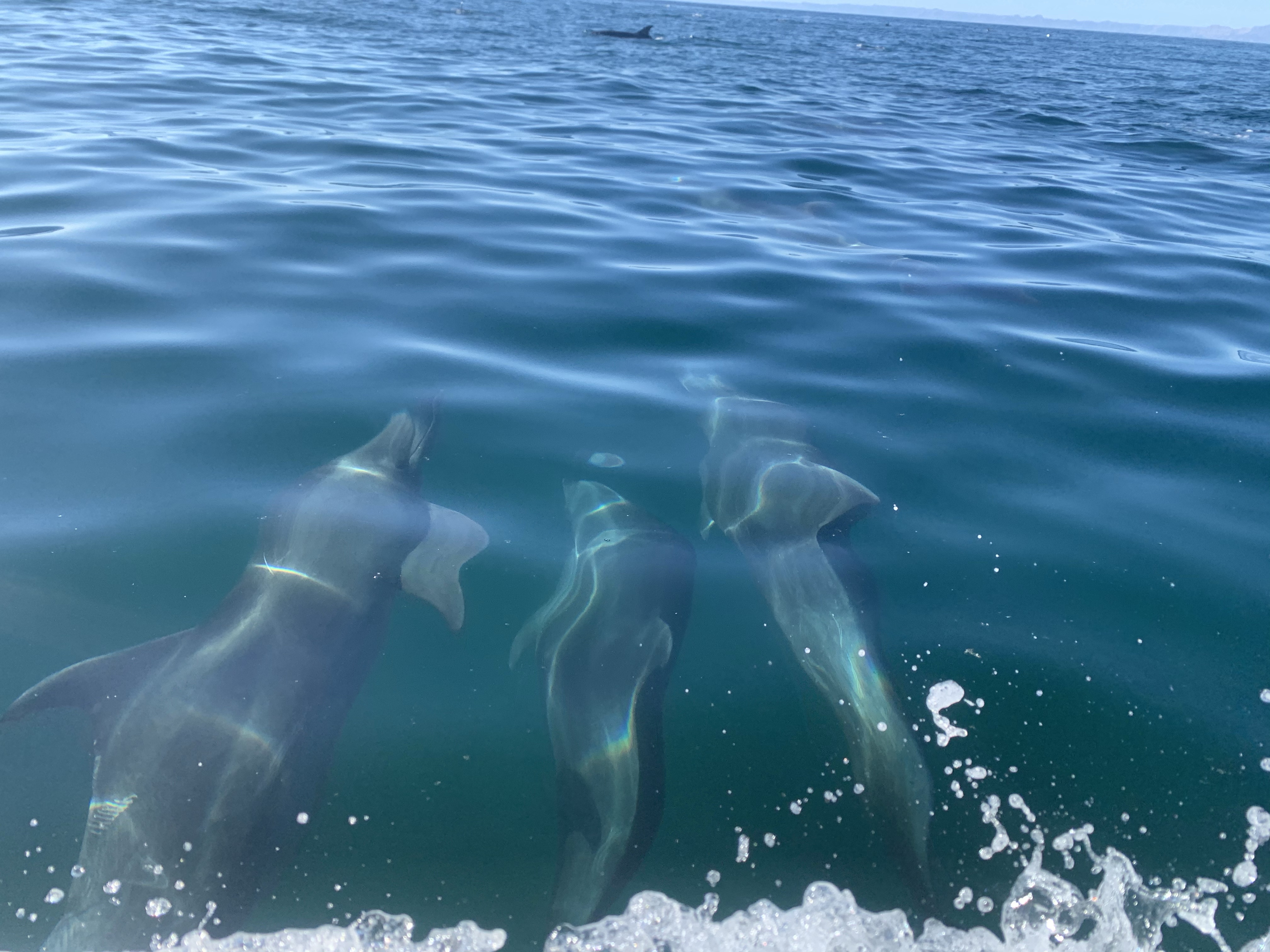 In the morning we were having coffee during sunrise when we heard exhaling and saw a few dolphins jumping near the boat. We went on deck and realized there was a large pod of them in the anchorage, having a wonderful time cavorting with each other in and around our boats and swimming back and forth to the rocky points at either end of the bay. They came and went during the much of the morning and we were even able to go out in the dingy with them. They swam off our dingy bow, turning sideways sometimes to look at me. They treated us to an impressive aerial show with pairs of dolphins leaping out of the water together just yards from us. It was life-affirming to be so close to them.