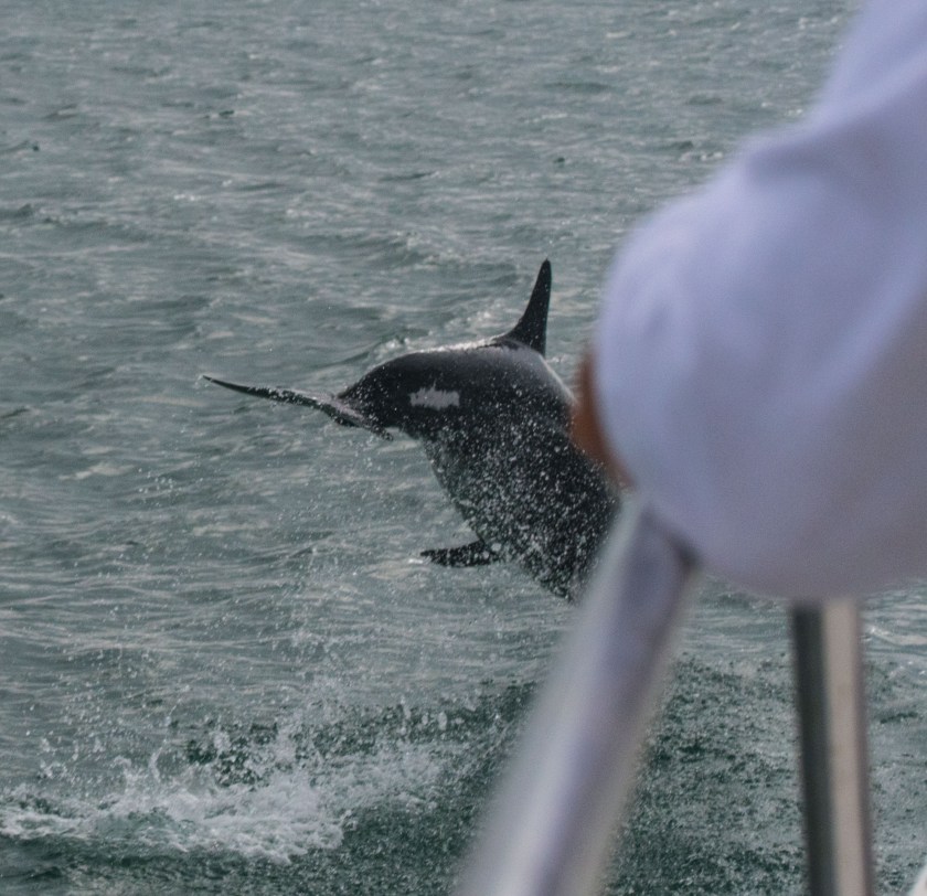 As it started to lift, we pulled up anchor to head around to the other side of the island. As we rounded the turn, a pod of dolphins headed right for us. They were very big dolphins, and they seemed to be having a fabulous time, leaping and diving. We clapped and yelled for them, and this seemed to make them jump even more – right next to the boat! I was lucky to get a few shots off – they were so close I wasn’t sure it was going to work with my telephoto lens, but I positioned myself as best I could and managed some lucky shots.