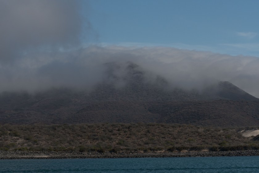 We awoke on the morning we knew we would have to move to the other side because of shifting wind to find ourselves socked in with good old northwest style fog! What a shock. We hadn’t known this might happen here (but later reviewed the paragraph in the guide that mentions it as a spring and summer phenomena). The volcano was shrouded in fog, and at times it was so dense we couldn’t see the other boat in the anchorage. The quintessential northwest sound of foghorns seems to be missing in Mexico.