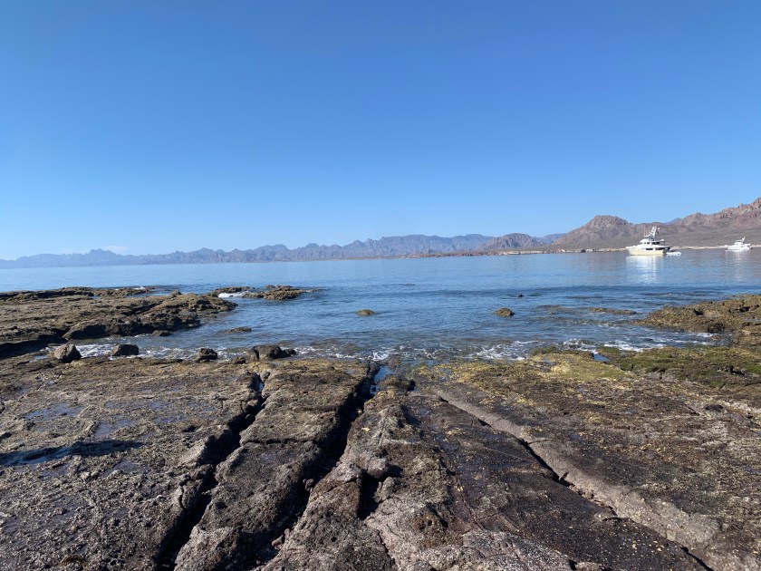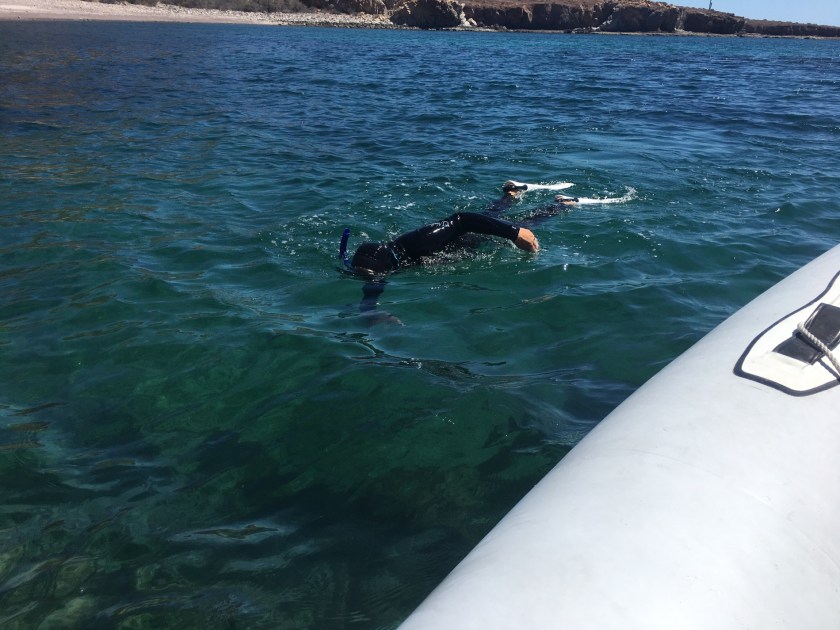 We started out at Punta Colorada, an open anchorage just around the southern tip of the island, mainly providing protection from north winds and swell. Our first night we were alone save for a sighting of a lone bighorn sheep on shore at dusk. For the first time this season, the water seemed warm enough to snorkel in, and we were thrilled to be able to suit up in our wetsuits, hoods and fins and snorkels and check out a couple of the rocky areas near shore. When I say warm enough, that’s by Pacific Northwest standards. It was still in the upper 60s but getting very close to 70.