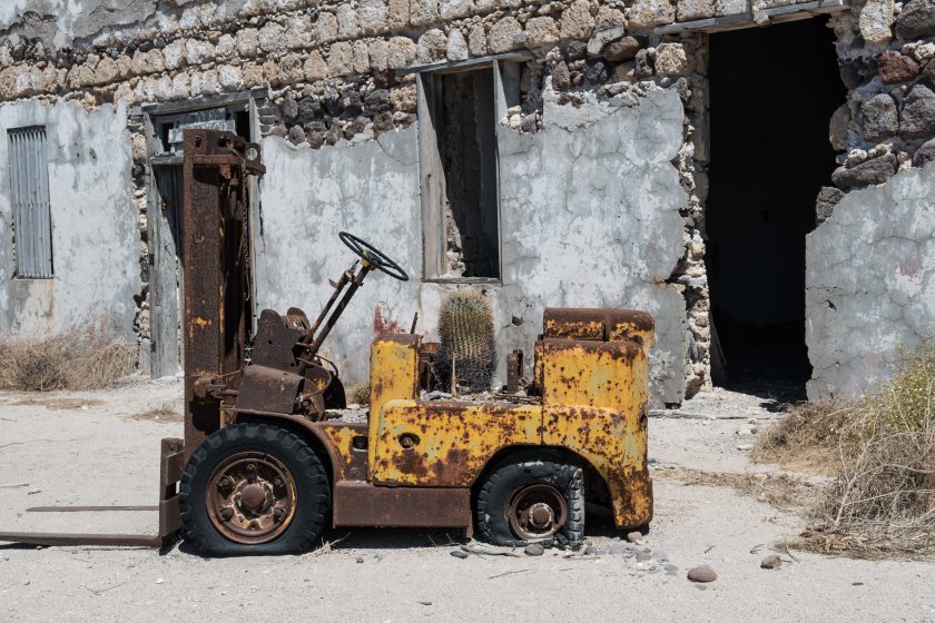 After a pleasant time at Punta Colorada we made our way about 10 miles north. This bay has natural salt flats which were first discovered by Jesuit Missionaries in 1698 and then operated more or less continually until the early 1980s when a salt mining operation started in Guerro Negro on the West Coast of Baja. The convenience of that operation – no long trip up into the Sea – effectively put the Salinas salt operation out of business. Some of the workers lived here in the small village, and apparently they were given short notice about the closing of the plant and had to leave in a hurry, but the last boat helping to remove their belongings wrecked on the beach.