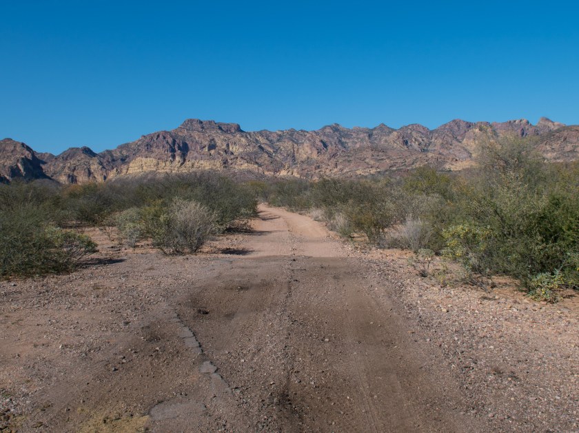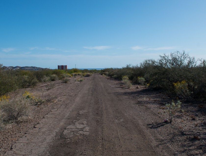 Overnight, a bit of wind and swell came in, enough to make it pretty uncomfortable even with the flopper stopper out, so we elected to brave the afternoon gales in Marina San Carlos again. The next day we rented a car to have lunch and look for the runway and ruins. We drove over to Bahia Algodones and had lunch at the outside Sunset Grill. We asked the waitstaff at Sunset Grill about the Catch 22 movie site, but they knew nothing of it at all. And we can see why. Everything on both sides of the road is fenced off and there are various bits of development happening or not happening in that typical Mexican way. We backtracked and finally found a dirt road off the highway that was going to a ranch that offered horseback riding. We took that road and veered off onto another that eventually crossed the runway. We found the asphalt still intact in some places but clearly being overtaken by the scrub. There were no structures whatsoever left.