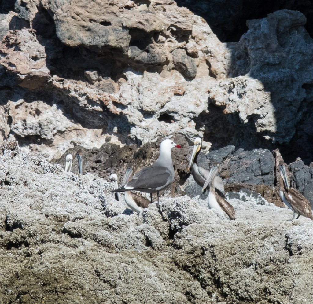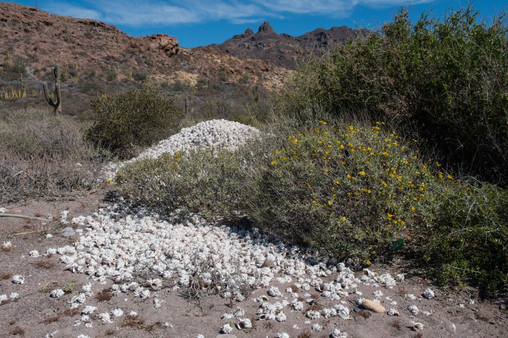 We took a little dinghy tour of the anchorage, looking at the sea caves that formed in Roca San Pedro right at the point of the anchorage. It was interesting to see Palm trees growing all over this large rock, in addition to the usual cactus. We went ashore, where there were remnants of a fish camp, particularly several dumps of conch shells that I called Conch Cemeteries. These shells seemed recent, retaining their sharp spines. The beach was mostly gravel and finely ground stone, forming a crescent shape and surrounded by low hills. It offered very good wave protection from the N and NW, but the winds funneled around either side of Roca San Pedro. The holding was very good as confirmed by our couple of windy days and nights. Morning sunrise over the hills was beautiful.
