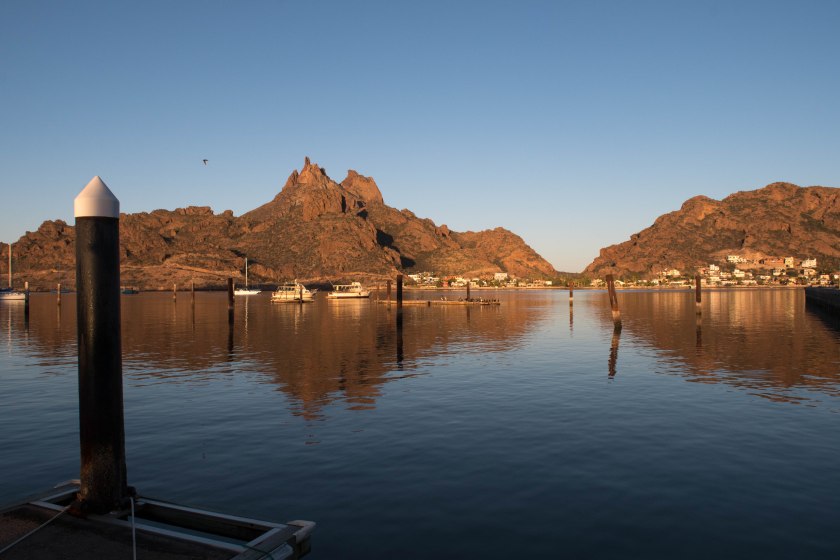 The wind stayed fierce until the next afternoon. That was fine because it was a chore day on the boat. I changed the oil and filters on the main engine and Gwen took the laundry in to the hotel and arranged for a boat wash for the next day. The next morning, it was calm and sunny. We had the boat washer at work – she is from Guaymas, the industrial city about 10 miles away, daughter of the captain of a shrimp boat and an incredibly efficient and hard worker. We also found Francisco, the diver, to clean the bottom of the boat, which had been developing some shaggy green growth along the waterline. As early afternoon came around, the winds started picking up again, and by mid afternoon we had whitecaps, 2 ft chop and 25+ knot winds again, coming right through the gap. This was getting old!