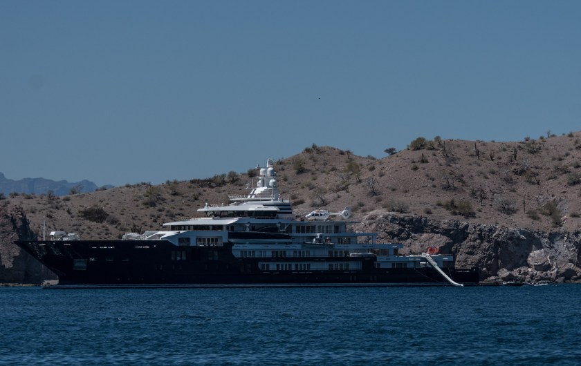 We set off from the S side of Isla Coronados to return to Agua Verde, where we had spent some time on the way up North in mid February (https://mvmissmiranda.com/2021/03/07/agua-verde/). It was a calm and pleasant cruise of about 5 hours, with sunshine and rising temperatures. By the time we arrived at Agua Verde it was 91 degrees. There were already 4 sailboats anchored in the “Agua Verde Yacht Club” or AVYC, also known as the fisherman’s beach, in the Northwest corner, so we elected to drop the hook right off the beach in front of the village. There was one other power boat anchored in the mouth of “Pyramid Bight”, and that was all. We put out the flopper stopper as usual and were a bit surprised by some swell coming in from the NE, where the bay is open. The afternoon heat drove us into the water, which was just under 70 degrees. Gwen put on mask and snorkel and swam over to shore. I took the more genteel approach of inflating a floaty toy and swinging on a line tied to the back of the boat. The swell calmed down by bedtime, and we had a pleasant, if warm, night’s sleep. When I awoke before dawn the next morning there was another power boat anchored not far from us, and two more heading in. One was the gigantic Megayacht Ulysses that was anchored near our friends Ron and Nancy the day before in Bahia San Francisco.