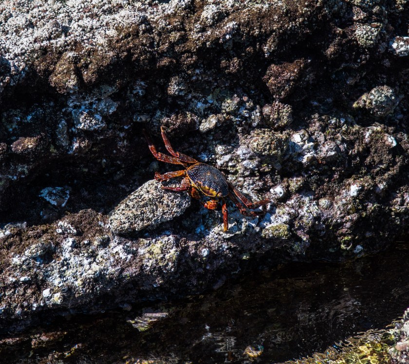 We got the big dinghy down to go ashore, and as we were doing that, we saw spouts jut offshore. We motored out and saw a couple of humpback whales swimming back and forth just outside in about 100 feet of water. We wanted to get a little bit closer… until one surfaced nearby and we realized how big they were. Gwen says I screamed like a girl. I steadfastly maintain that I was merely commenting on the majestic creatures. Afterwards we went ashore to walk along the beach, explore the rock formations, and walk out on one of the reefs at low tide. The sandstone was very cool. It was easy to rub off bits of it from the rock, so you could see how the jagged bits of it were eventually worn down into smooth shapes. There were lots of tide pools on the reef, but as we have come to expect, none were particularly rich with life. There were a fair number of crabs on the rocks and Gwen got some good pictures of the increasingly rare Sally Lightfoot crabs.