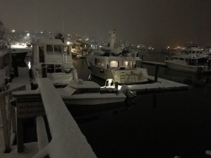 We’ve finally made the move from Seattle up to Anacortes, where we own, but have rented out for the past couple of years, a condo in Skyline.  The condo is having some remodeling done, so we’ve been living on the boat for the past couple of weeks.  We were greeted with plenty of snow and cold weather, as you can see here.